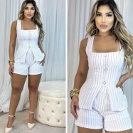 COD 5432 CONJUNTO BLUSA SHORT BOTÕES ELASTICOS CINTURA E COSTAS CREPE LISTRADO BRANCO TAM M