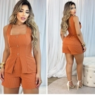COD 5442 CONJUNTO CROPED E SHORTSAIA ALFAIATARIA MARROM ZIPER NA LATERAL BOTÕES E CINTO TAM M