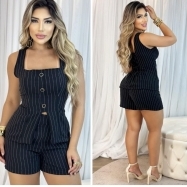 COD 5434 CONJUNTO BLUSA SHORT BOTÕES ELASTICOS CINTURA E COSTAS CREPE LISTRADO PRETO TAM M