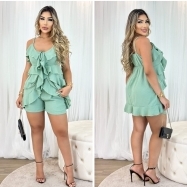 COD 5435 CONJUNTO BLUSA BOHO SHORT AMAARAÇÕES ALCINHAS REGULAVEIS E BOLSOS CREPE VERDE TAM M