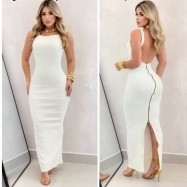 COD 5469 VESTIDO LONGO FENDA EM MALHA LUREX BRANCO COM PRATA DETALE DOURADO SHORT NUDE TAM M