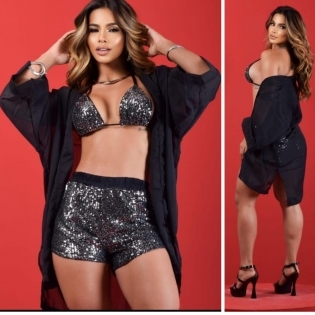 CONJUNTO 03 PEÇAS KIMONO EM ORGANZA SHORT E TOP SEM BOJO EM MALHA PAETÊS PRETO PRATA VESTE 40 A0 42