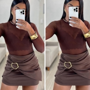 COD 5388 CONJUNTO SAIA MALHA GROSSA COM DETALHE DOURADA BLUSA TULE TAM G