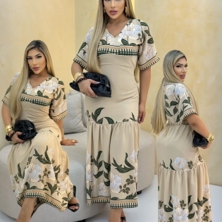 COD 5407 VESTIDO LONGO CREPE BEGE FLORAL ELASTICO NAS COSTAS DECOTE V VESTE 38 AO 42