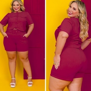 COD 5428 CONJUNTO SHORT BLUSA CINCO BOTÕES E BOLSOS MALHA SCULBA VINHO VESTE 50 AO 52