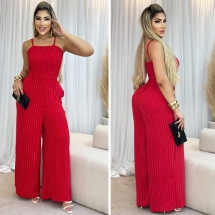COD 5420 MACACÃO CREPE LISTRADO VERMELHO BOLSOS ALÇAS REGULAVES E ZIPER NAS COSTAS TAM G