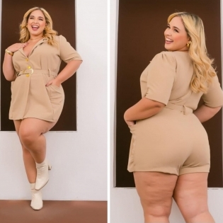 COD 5425 MACAQUINHO COM CINTO BOLSOS ALCINHAS ILHÔS DOURADOS MALHA SCULBA NUDE VESTE 50 À 52