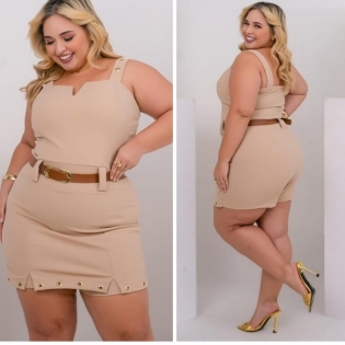 COD 5425 MACAQUINHO COM CINTO BOLSOS ALCINHAS ILHÔS DOURADOS MALHA SCULBA NUDE VESTE 50 À 52