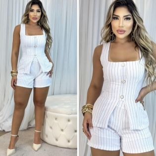 COD 5432 CONJUNTO BLUSA SHORT BOTÕES ELASTICOS CINTURA E COSTAS CREPE LISTRADO BRANCO TAM M
