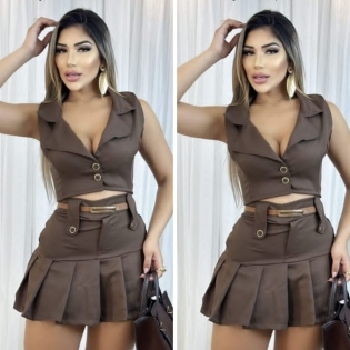 COD 5442 CONJUNTO CROPED E SHORTSAIA ALFAIATARIA MARROM ZIPER NA LATERAL BOTÕES E CINTO TAM M