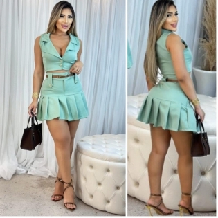 COD 5443 CONJUNTO CROPED E SHORTSAIA ALFAIATARIA VERDE ZIPER NA LATERAL BOTÕES E CINTO TAM M