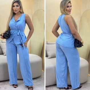 COD 5445 CONJUNTO CALÇA PANT COLETE E FAIXA EM CREPE LISTRADO AZUL BOLSOS E ELESTICO NO CÓS TAM G