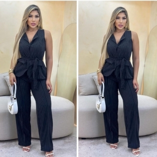 COD 5447 CONJUNTO CALÇA PANT COLETE E FAIXA EM CREPE LISTRADO PRETO BOLSOS E ELESTICO NO CÓS TAM G