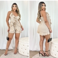 COD 5436 CONJUNTO BLUSA BOHO SHORT AMAARAÇÕES ALCINHAS REGULAVEIS E BOLSOS CREPE NUDE TAM M