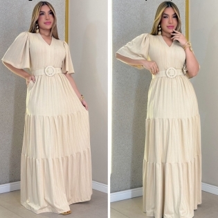 COD 5454 VESTIDO LONGO EM MALHA SCOLTT NA COR BEGE COM BOLSOS CINTO DO MESMO TECIDO VESTE 42 AO 44