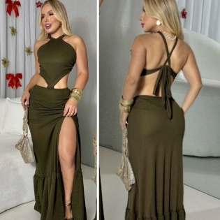 COD 5474 VESTIDO LONGO ARRASTÃO FENDA E AMARRAÇÕES NAS COSTAS NA COR VERDE S/BOJO TAM M