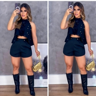 COD 5494 CONJUNTO SHORT E CROPED FRENTE UNICA COM ELASTICO NAS COSTAS E APLICAÇÕES TAM M