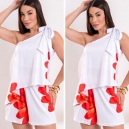 COD 5483 CONJUNTO SHORT E BLUSA OMBRO UNICO MALHA DIGITALIZADA BRANCO COM VERMELHO VESTE M/G