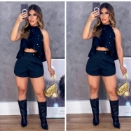 COD 5494 CONJUNTO SHORT E CROPED FRENTE UNICA COM ELASTICO NAS COSTAS E APLICAÇÕES TAM M