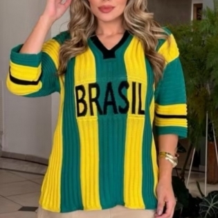 COD 5531 BLUSÃO EM TRICO MODAL VERDE AMARELO PRETO LOGO BRASIL VESTE 38 AO 44