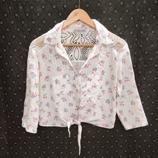 COD 0562 BLUSA CROPED EM TECIDO DE ALGODÃO FLORAL COM APLICAÇÃO EM MALHA TAM P