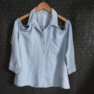 COD 0563 CAMISA FEMININA EM VISCOLINHO AZUL CLARO OMBROS VAZADOS BOLSO E BOTÕES TAM M
